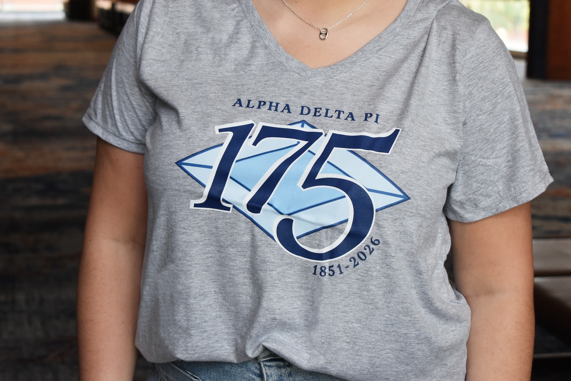 Alpha Delta Pi is turning 175 – let’s celebrate!! This sport gray ladies cut V-Neck features the 175th design in shades of navy and azure blues. It is sure to become your favorite V-neck of 2026.